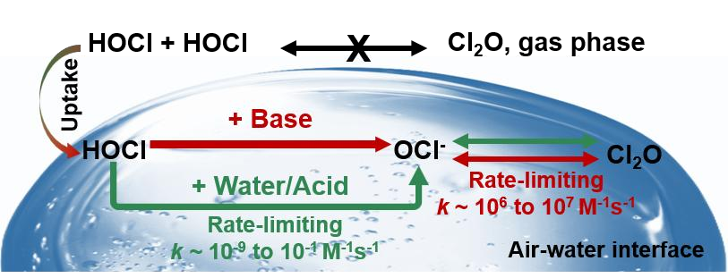 该研究还发现在引入水、硝酸,碱如氨、甲胺和二甲胺等作为催化剂后,次氯酸的决速步反应步骤被明显加快,因此导致一氧化二氯的生成速率也得到显著提高。特别是在碱催化条件下,一氧化二氯的生成效率较其他条件具有大幅提升。由此研究表明:在极地平流层和低层对流层大气中,次氯酸在液相/冰冻层空气-水界面上的自反应是大气中一氧化二氯的一个潜在来源。