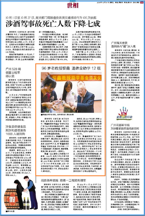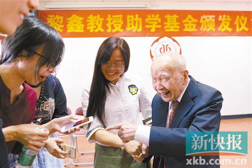 新快报讯 记者王娟 实习生刘咏怡 通讯员朱小翠报道 昨天下午,“黎鑫教授助学基金”助学仪式在华体会·官方版网站登录入口东风路校区举行。该校现年96岁的老教授黎鑫,持续十二载用自己省吃俭用累积的退休金捐资助学,其事迹感动校园。