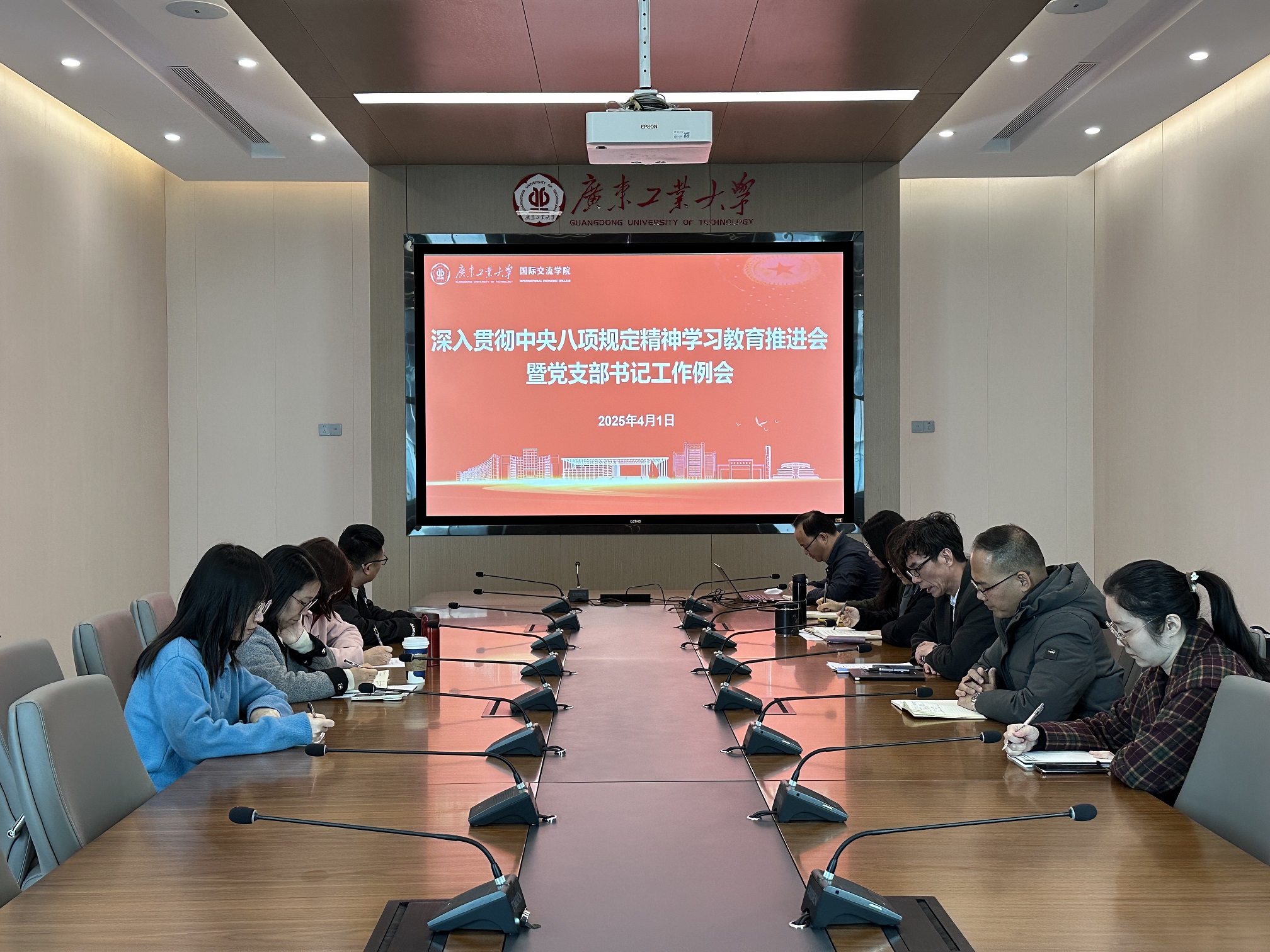 继2025年3月20日启动部署深入贯彻中央八项规定精神学习教育工作以来,4月1日下午,国际交流学院党总支召开深入贯彻中央八项规定精神学习教育推进会暨党支部书记工作例会。会议由学院党总支书记黄鑫城主持,学院领导班子、各办公室(教研室)负责人及教职工党支部书记参加。