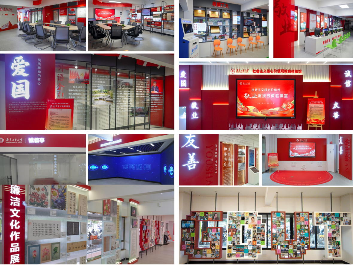 扎实推进“一站式”学生社区建设。分批规划建设学生社区育人阵地与活动场馆,为师生开展党团教育、榜样引领、学业帮扶、心理咨询、就业服务等提供保障,目前室内活动空间面积达1745平方米,户外活动阵地面积达1000平方米,不断拓展思想教育场域阵地。依托学生市区社会主义核心价值观体验馆开展体验式教育,打造“爱国”“敬业”“诚信”“友善”沉浸式实践体验课堂,着力打造“社区党建+”“社区教育+”“社区服务+”和“社区管理+”等育人品牌活动。学校获评广东省“一站式”学生社区建设A类高校。